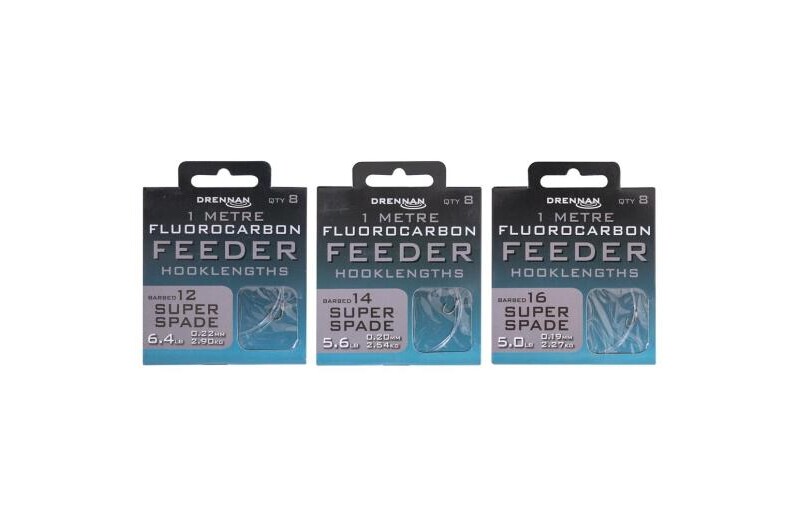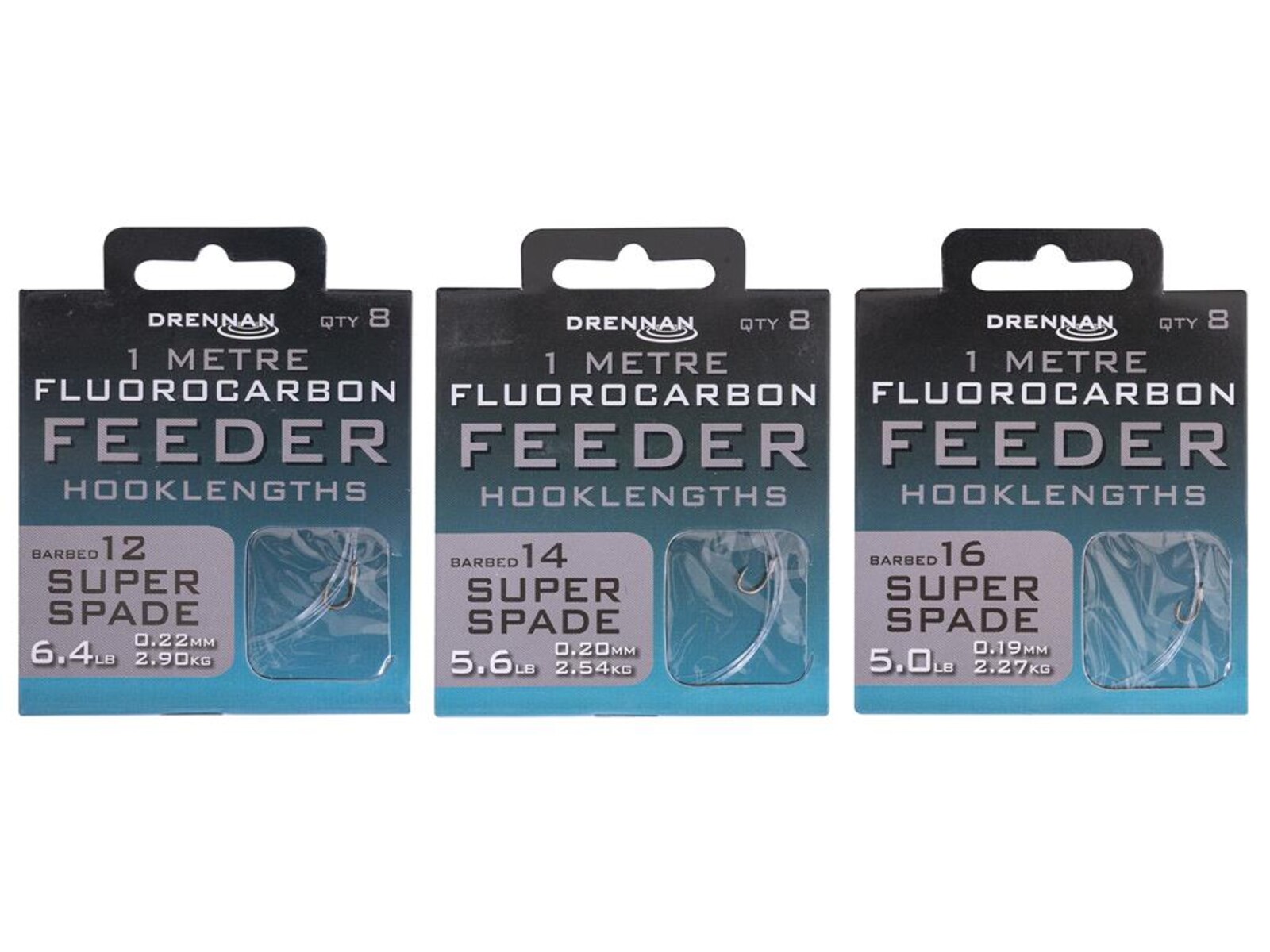 Fluorocarbon is virtually invisible in water, sinks fast and holds bottom better than monofilament. Super Spade 1 Metre Fluorocarbon Feeder Hooklengths are the perfect choice for targeting big fish such as barbel, chub, tench and bream. Fishing the hookbait a full metre from the feeder often results in more bites especially on clear rivers and stillwaters.