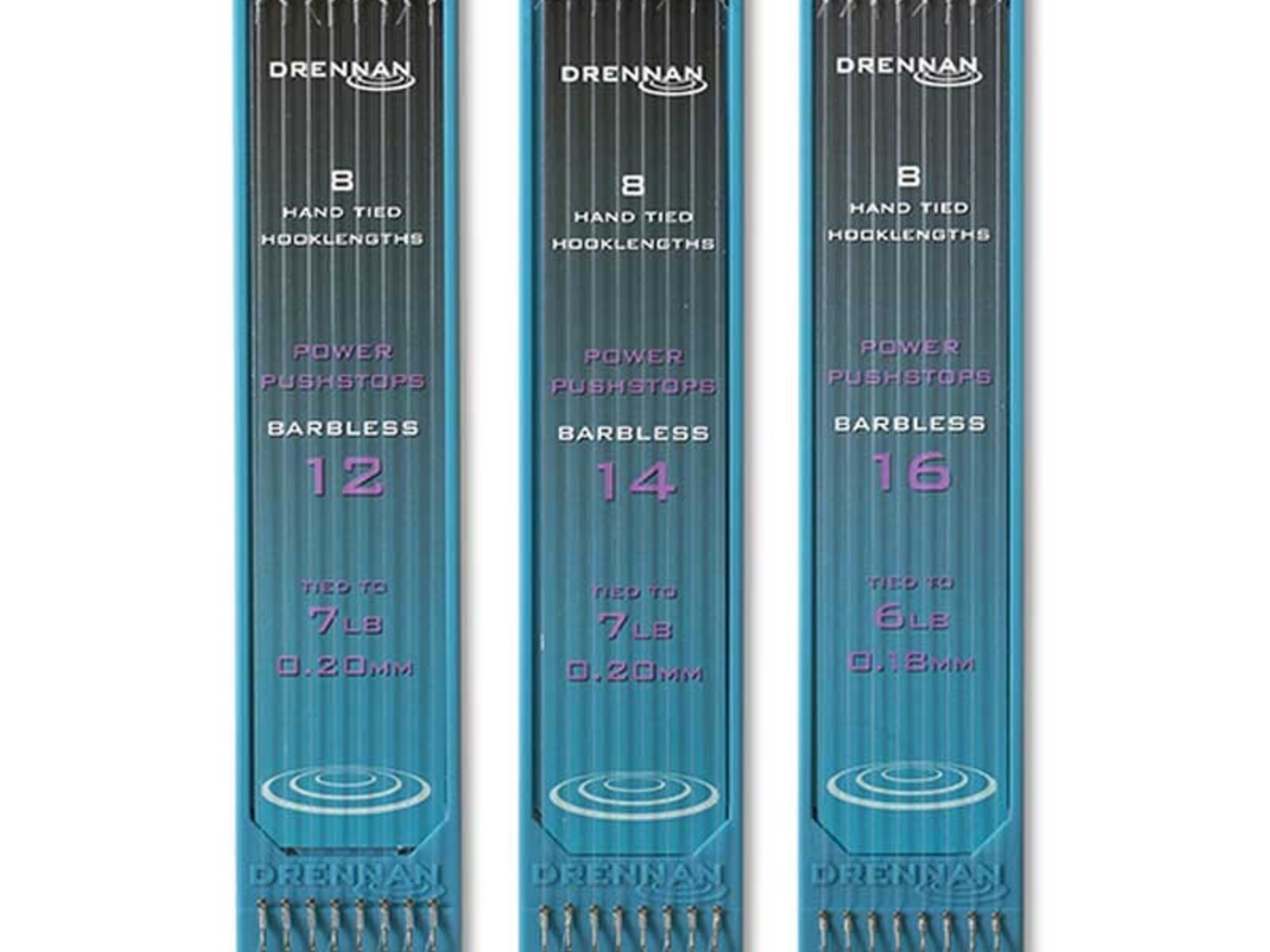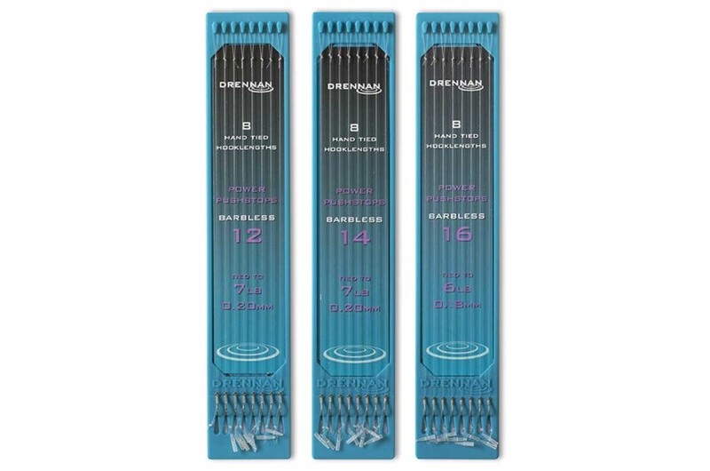 The Barbless Power Hair Rigger hooks used on these Power Pushstop hook lengths have an acute upturned eye this sits the hook dead straight on the hook link providing improved presentation and hooking ratios. The length of the hair on these rigs is matched to the hook size. When used with a Pushstop Pusher, they are one of the quickest and most efficient ways of baiting up.