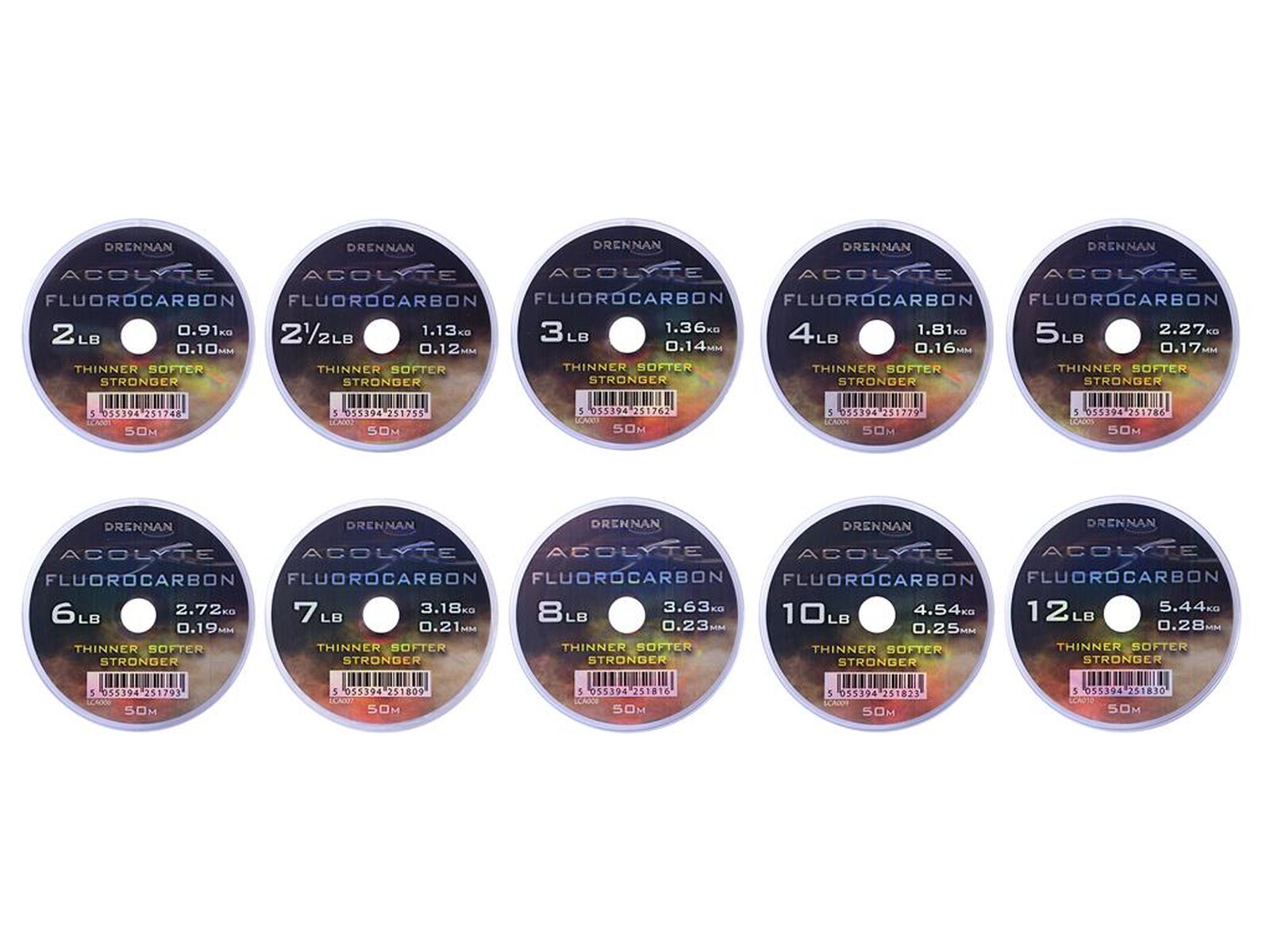 Acolyte Fluorocarbon is made from a new hi-tech material that is thinner, softer and stronger than other fluorocarbons. Being 100% pure fluorocarbon offers superior performance and stealth, as it has a refractive index very close to that of water, making it the ultimate hook-length material.