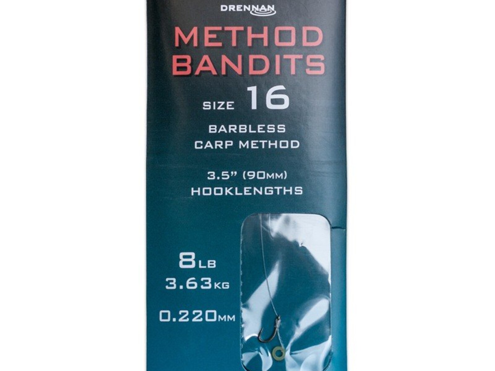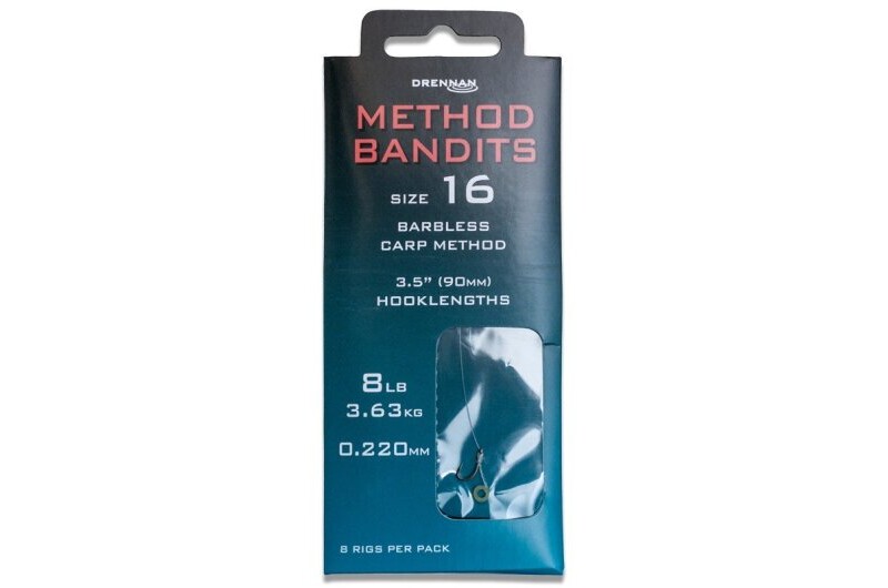 Drennan Method Bandits are convenient, pre-tied hooklengths complete with hair-rigged latex bait bands and perfect for the Method feeder. The strongest Method Bandits are tied to our robust Carp Method hooks in sizes 8 to 16 and with hooklength diameters from 0.24mm (10lb) down to 0.22mm (8lb). Each hooklength is 90mm long, which we believe is the optimum length for an effective Method feeder or pellet feeder setup. The hair-rigged latex band can be used to mount a number of hook baits. It can be stretched around a hard pellet or dumbbell boilie with the help of a Drennan Band Stretcher. Alternatively, it can be pulled inside a soft pellet, drilled boilie or cube of meat with the help of a Drennan Pellet Band Puller. Method Bandits are individually hand tied and, just like our already popular Carp Method Pushstop Hair Rigs, they are packed straight to avoid any chance of kinking.