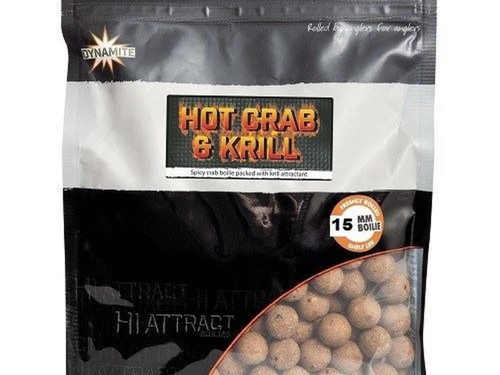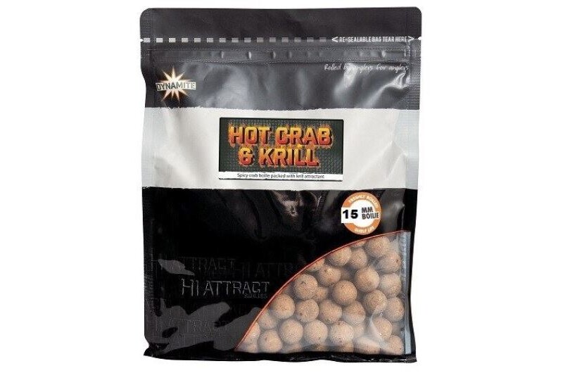 Dynamite Baits Hot Crab & Krill 15mm Boilies, with a top quality fishmeal base containing a winning combination of top quality premium ingredients. Sourcing Antarctic krill, shellfish meal and blending in a hint of chilly for that extra kick. A bait that's proved highly effective in testing and available in 1Kg and 1.8Kg bag sizes. A matching liquid food attractant and popups are also available.