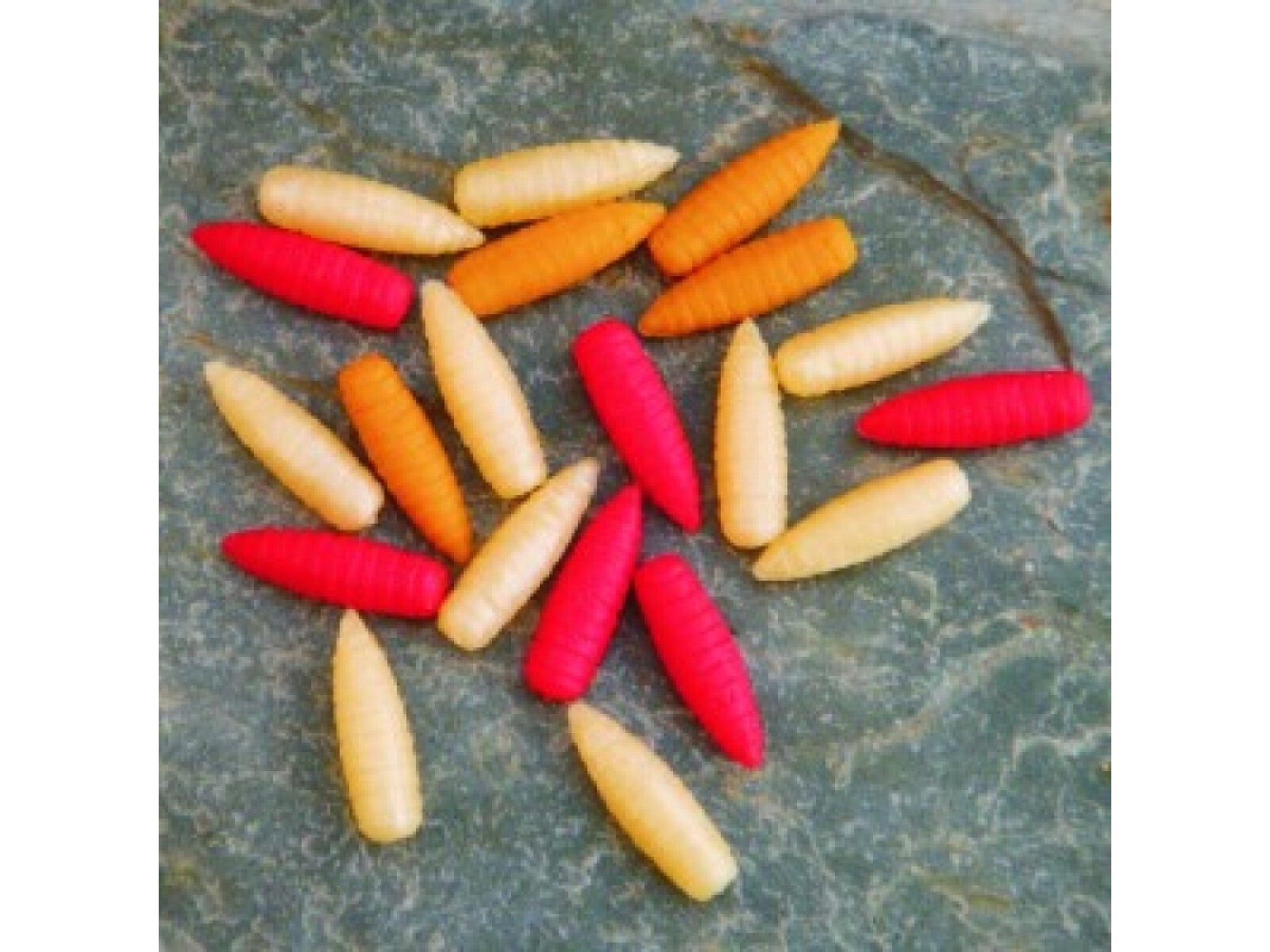 It was Rob Maylin who discovered that by sliding one of our fake maggots over the eye of the hook, it not only created a line aligner effect which ensures the hook turns in the fishes mouth, resulting in very efficient hooking, but also helps to disguise the hook. With 2 or 3 real maggots nicked on the hook and fished helicopter style in conjunction with a large PVA bag of maggots, Rob had created one of the deadly carp rigs ever. He named it the Mag-Aligner.