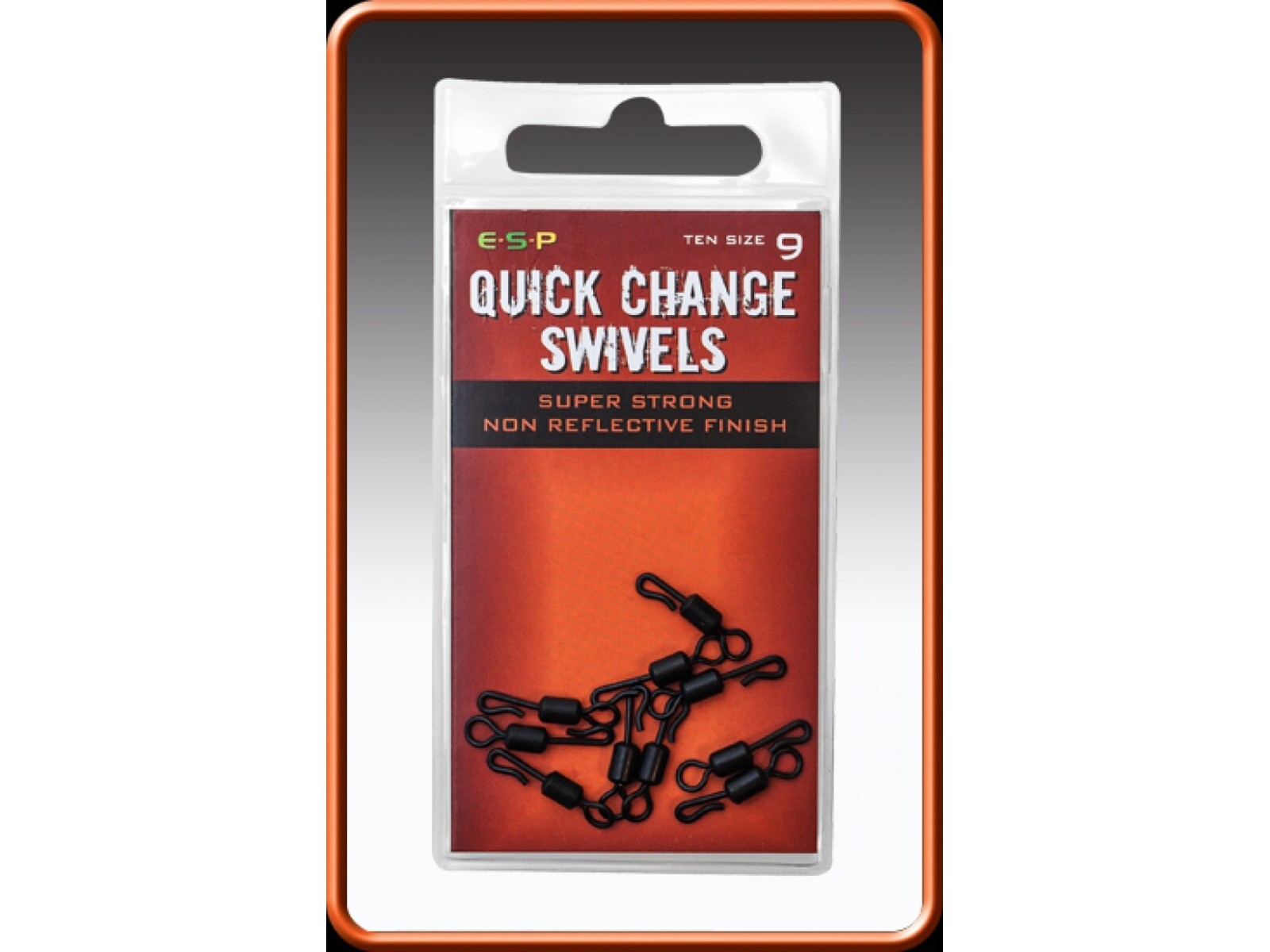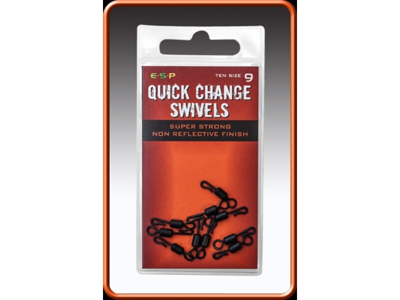These Quick Change Swivels are size 9, are extra strong and have a smooth matt black finish. They fit perfectly into the ESP lead clips and the crook allows you to quickly change looped hooklinks. For an efficient anti-tangle set up, quick change swivels are best used with and ESP Streamliner Rig Boom. This also tends to push the hooklink away from the lead. 10 swivels per packet.