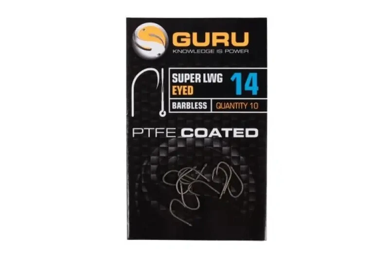 The original LWG established itself as an astonishingly popular pattern. Guru have now introduced a premium version of this – the Super LWG! Featuring a round bend and wide gape with an inturned point, the Super LWG is PTFE coated to ensure the hook remains strong, durable and discrete in appearance. A single hook has proved to last throughout intense bagging sessions. The ‘Wasabi’ point stays razor sharp to give you maximum hooking capability at all times. The hooks are perfect for presenting all kinds of baits, from maggots, casters and worms, to meat, corn and pellets. The eyed versions are superb for hair rigging a band when using hard pellets, or for holding a Speed Stop to present hair-rigged baits.
