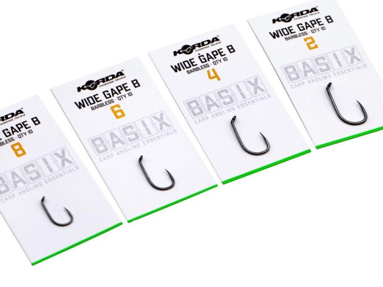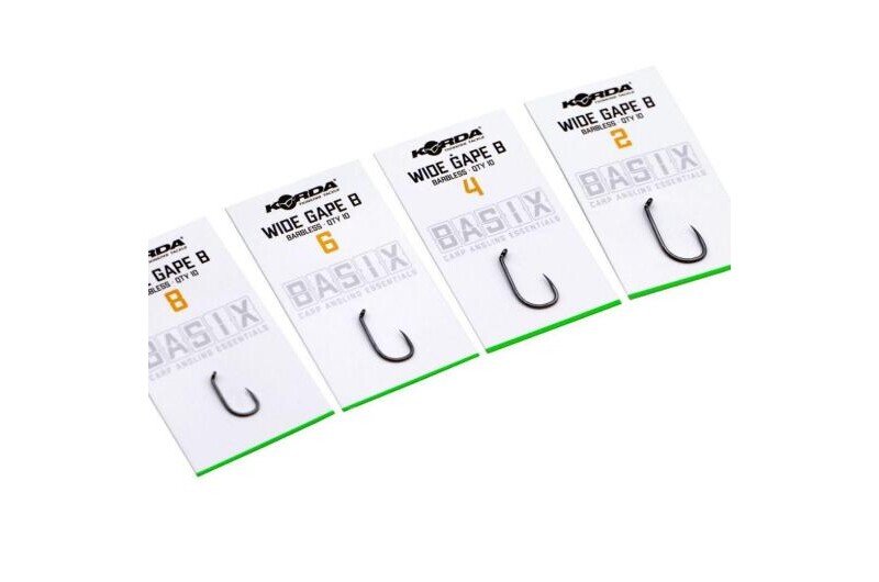 Korda BASIX Wide Gape Hooks are available in Barbed and Barbless versions in sizes from 2, 4, 6 and 8. Each packet contains ten hooks.