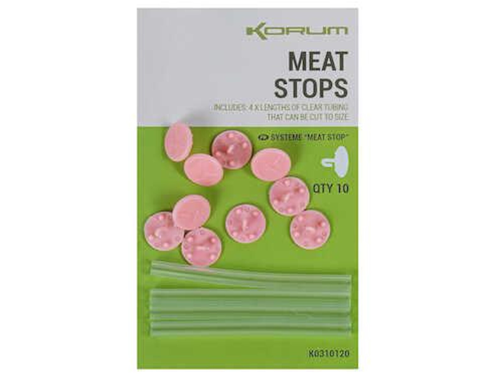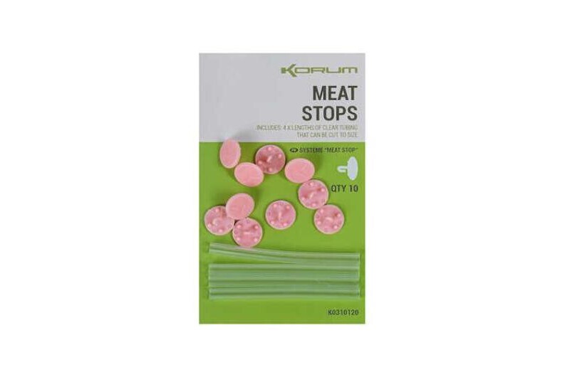 The Korum Meat Stop system has been designed to improve the durability of meat hookbaits, providing a specially designed bait stopper with a number of unique characteristics. Firstly, the large flat surface stops softer meats from being pulled off the hair by small fish - it also provides an impact shield when casting or retrieving quickly. The gripper prongs keep your bait in top condition. Used in conjunction with the clear tubes, the small hook keeper locks inside the tube. The tubing also prevents the thin hair from cutting through the sides of meat baits.