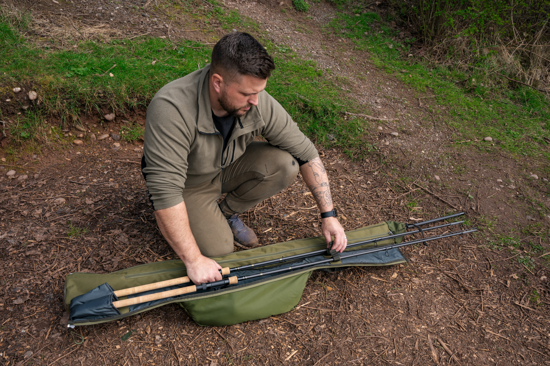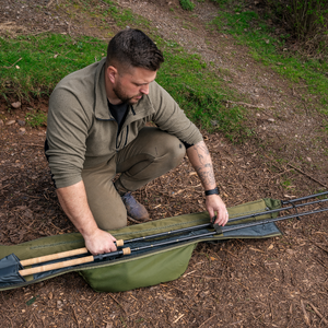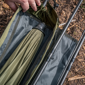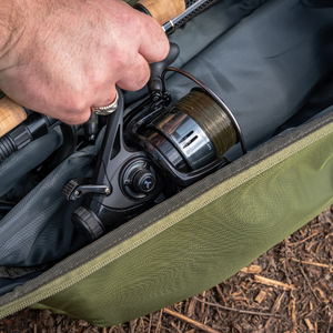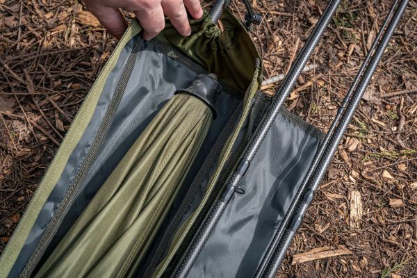 An innovative new way to carry your loaded rods and reels, alongside your shelters, brollies and bankware. The compartment for your rods hinges away from the rear shelter compartment, providing all the benefits of a quiver with added rod protection. Has a padded area designed to house two rods and up to 8000 sized reels, plus a larger rear compartment that fits brollies and nets inside. Also features a simple outer pocket for net handles or banksticks. Complete with removable and adjustable padded shoulder strap for comfortable transportation.