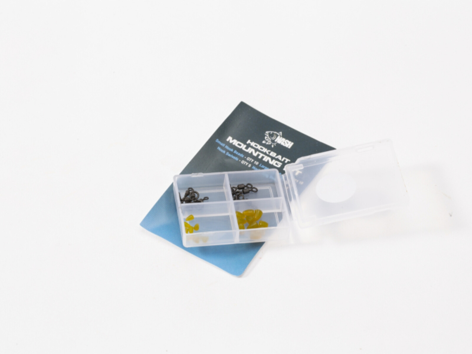 The Hookbait Mounting Kit includes both large and small Diffusion Camouflage Hook Beads plus Hook Swivels and Hook Ring Swivels for sliding hairs, improved anti-eject properties and creating aggressive fast turning rigs.
