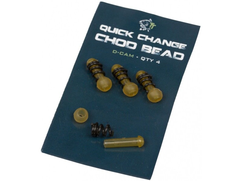 tied and even ready baited chod rigs can be replaced instantly, the hooklink swivel rotating into position on the centre coil before the two part bead is pushed together again. Quick Change Chod Beads are a superior and safer solution to swivels on the line when fishing Naked Chods, preventing line breakage from the acute angle of pull created by a hooked carp when a metal swivel runs direct on mono or fluorocarbon. In event of line breakage Quick Change Chod Beads slide freely over leader loops and knots for improved rig safety. Four beads per packet.
