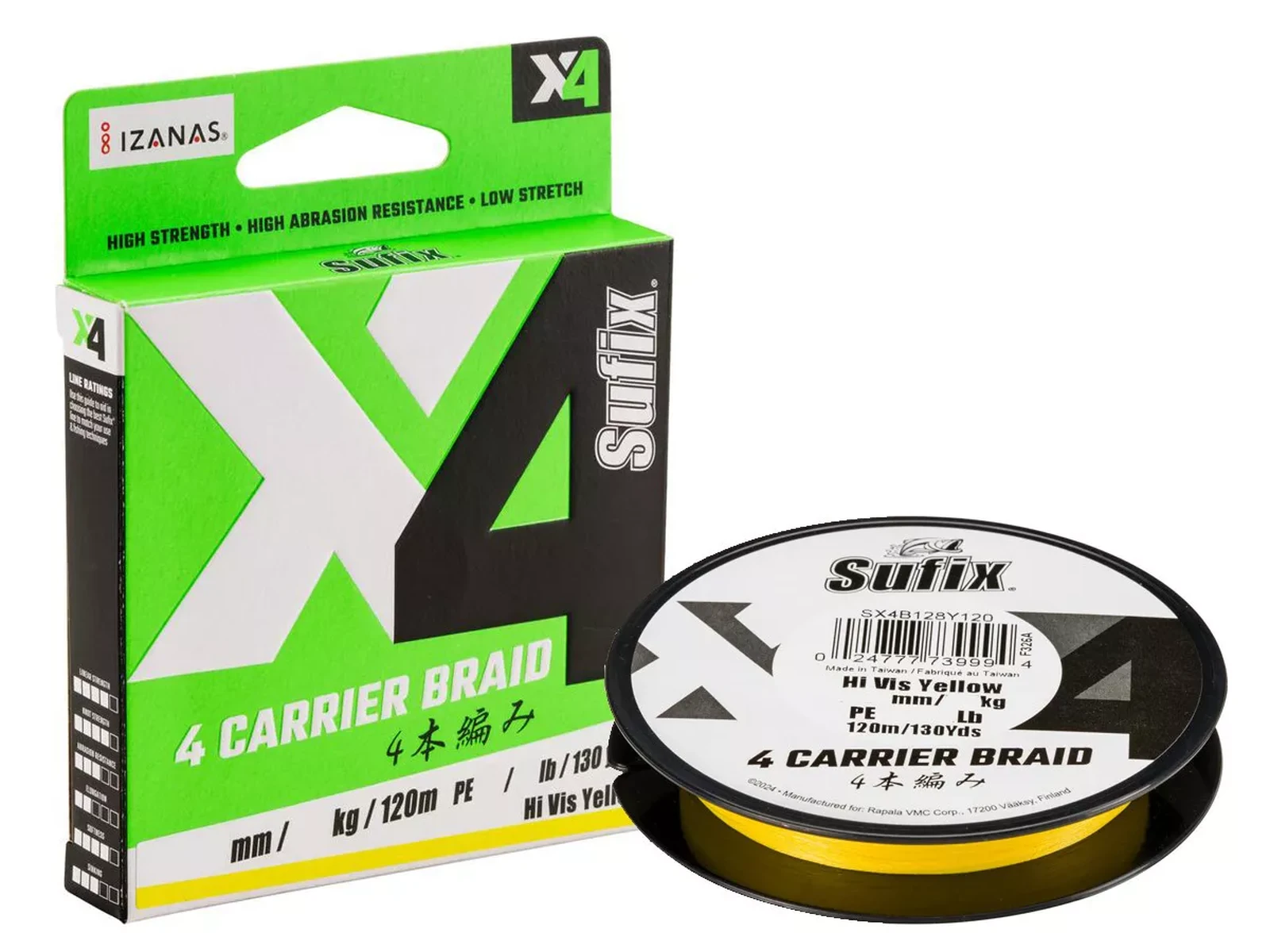 A four carrier premium braided fishing line made with 100% Japanese UHMPE fibers for high breaking strength and extreme abrasion resistance for fishing in demanding conditions and large baits. Super low stretch improves sensitivity and hooksets.