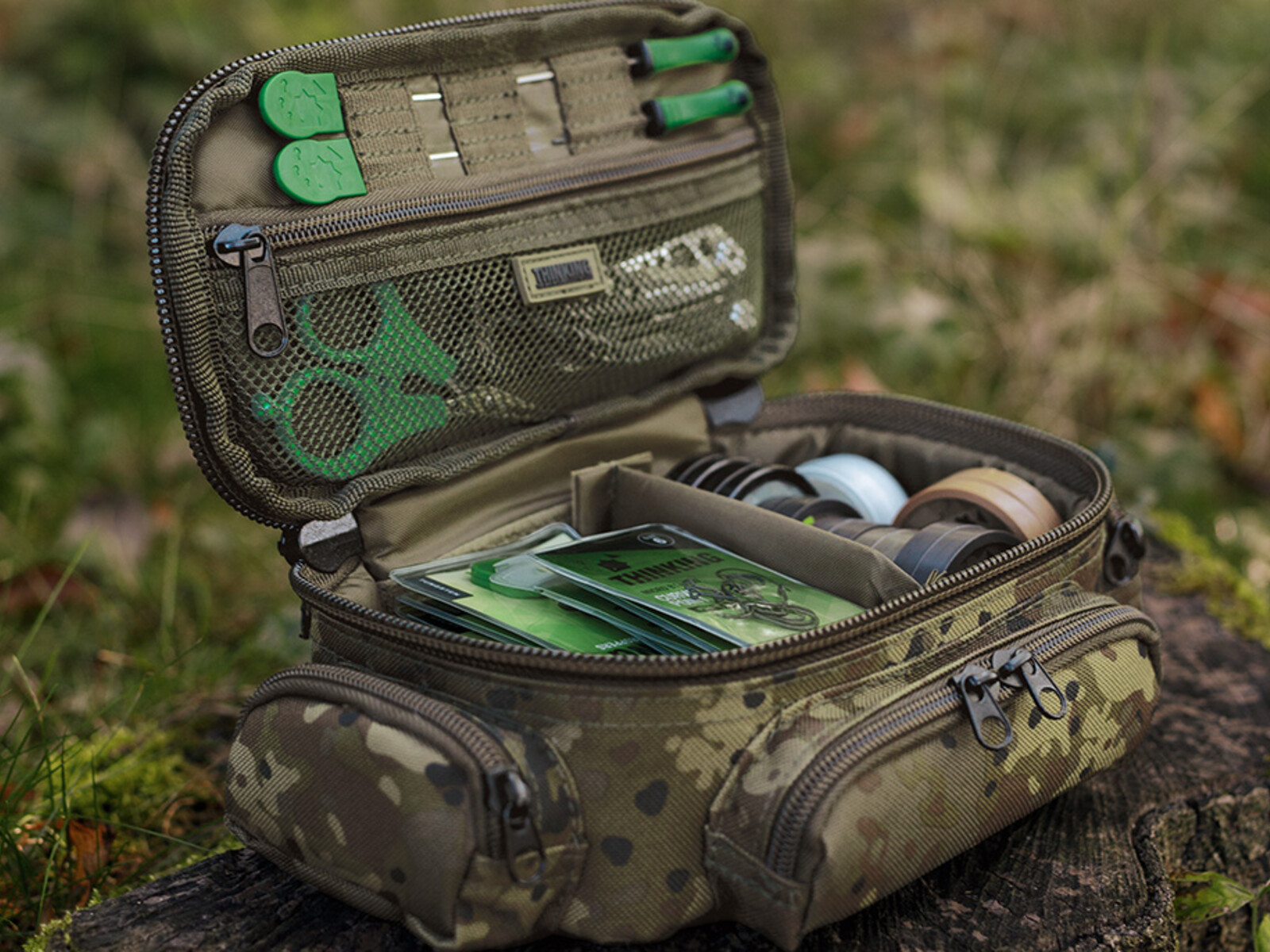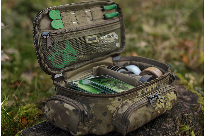 A compact tackle pouch made from our 600D Camfleck material with a wipe-clean, waterproof base that fits perfectly in the top of the Thinking Anglers Rucksack. The main compartment features a moveable divider that can be tailored to fit hooklink spools and smaller terminal items. The end pockets are ideal for hook boxes or spare leads, whilst the front pocket is ideal for storing bobbin heads or a hook sharpening kit.