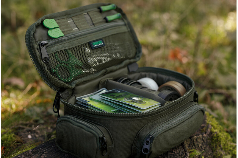 A compact tackle pouch made from our 600D Olive material with a wipe-clean, waterproof base that fits perfectly in the top of the Thinking Anglers Rucksack. The main compartment features a moveable divider that can be tailored to fit hooklink spools and smaller terminal items. The end pockets are ideal for hook boxes or spare leads, whilst the front pocket is ideal for storing bobbin heads or a hook sharpening kit.